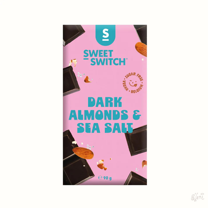 vegán, gluténmentes "dark almonds and sea salt" étcsokoládé, hozzáadott cukor nélkül, édesítőszerrel